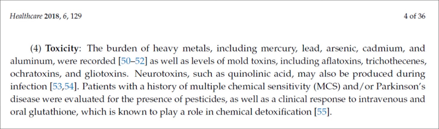 I find these heavy metal toxins in a large percentage of my sick patients who come to see me, and prior US governmental reports highlighted that everyone tested has glyphosate in their system. I reported the elevated heavy metal toxins and pesticides in the journal Healthcare in 2018 when we reported the results of screening 200 sick chronically ill Lyme patients using the 16 point MSIDS model. This is from the article regarding toxicity: