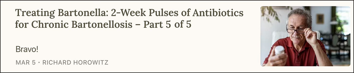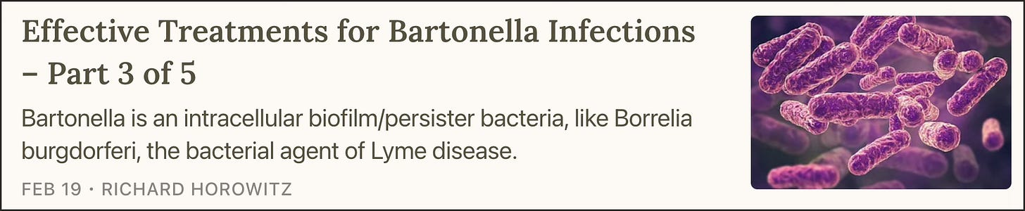 Based on the patients symptomatology, living right next to a highly tick-borne region with frequent mold exposure, wildfire smoke and exposure to pesticides, heavy metals and cyanobacterial toxins, I am fairly certain that a good number of those individuals still suffering with chronic symptoms have chronic infections (Lyme, Bartonella, possibly Babesia) and environmental toxins as the primary drivers of their illness with associated MSIDS Factors listed above. More information on treating Lyme, Babesia and Bartonella can be found below: