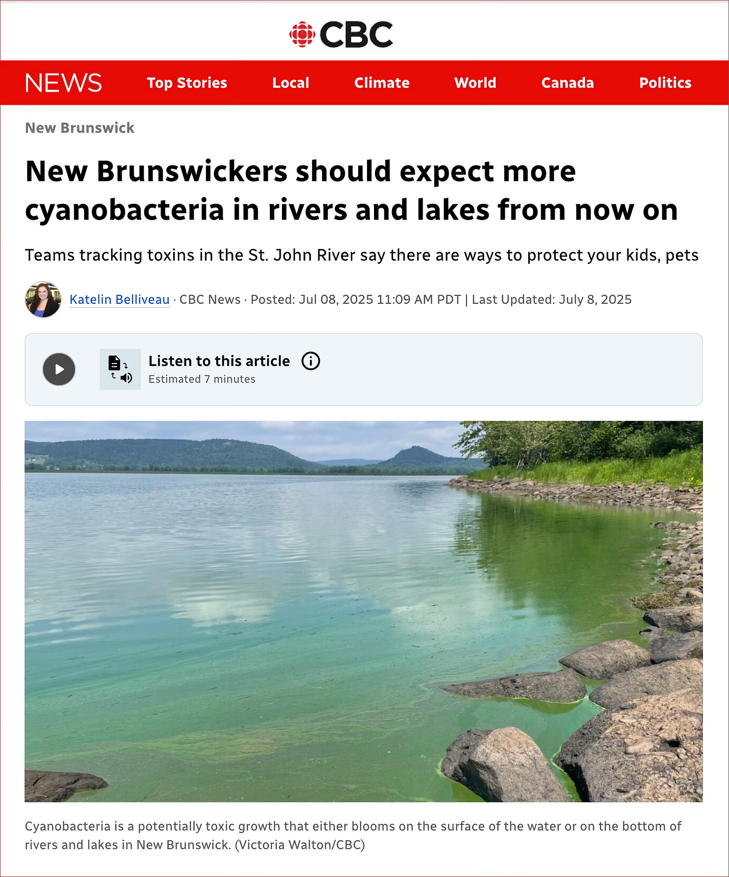 Quote from: https://www.cbc.ca/news/canada/new-brunswick/water-quality-report-new-brunswick-1.5357930#:~:text=Toxic%20algae&text=John%20River%20and%20has%20been,Falls%20and%20Florenceville%2DBristol%20areas.&text=A%20couple%20of%20lakes%20also,and%20a%20longer%20growing%20season.