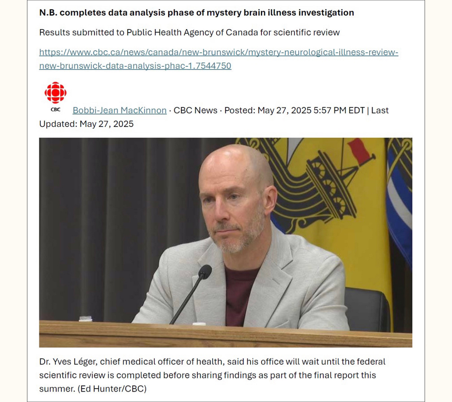 CBC News published an updated report on May 27, 2025, roughly 5 years after the initial investigation started, where New Brunswick completed the data analysis of the ‘mystery brain illness’ investigation. You can read the updated report here: