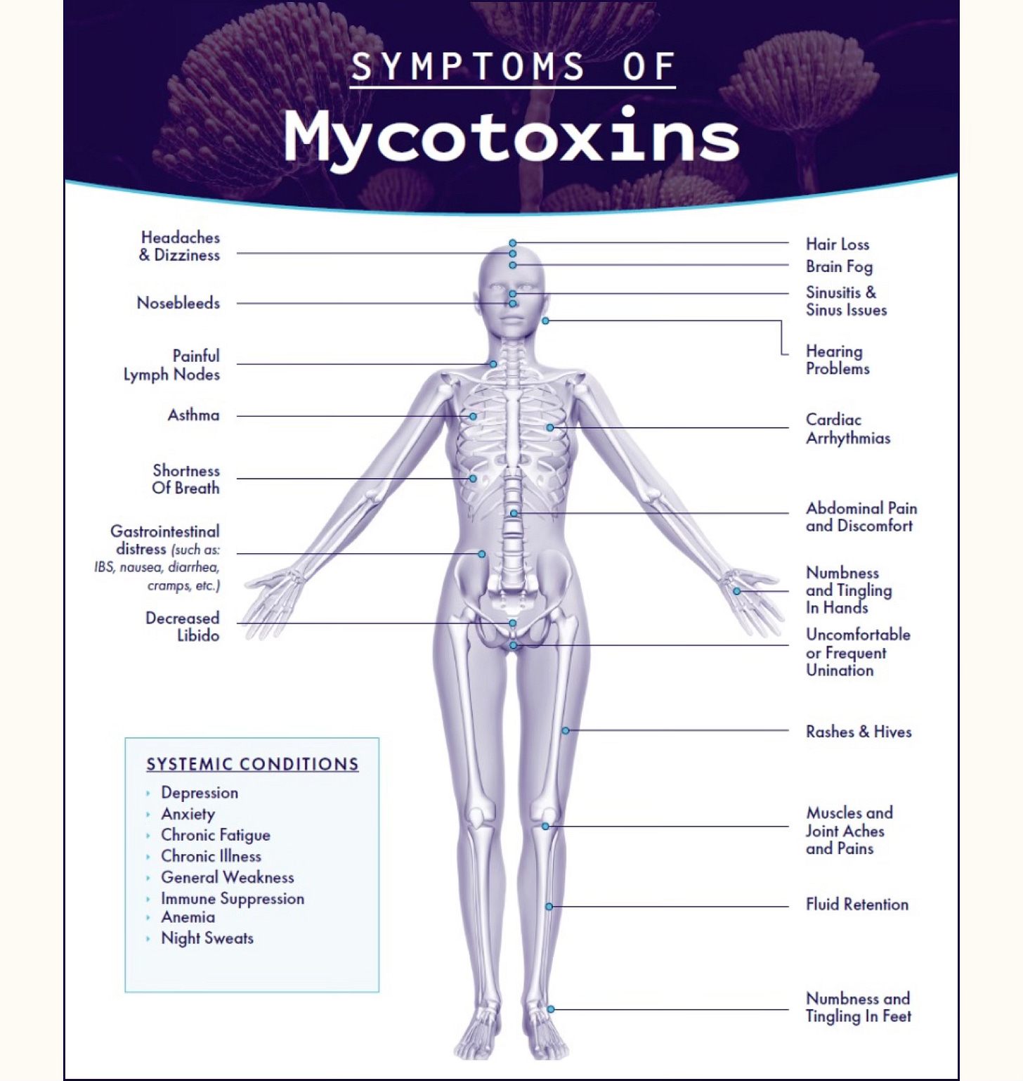 Here is where a functional medicine work-up would be helpful. Since heavy metals don’t stay in the blood for very long, getting a hair and urine analysis (and potentially 6 hour urine DMSA challenge) could help. What other toxins are potentially present that can cause some of these symptoms in New Brunswick and are NOT usually checked for? Mold. This is highly likely. See the chart below with symptoms from mold toxin illness: