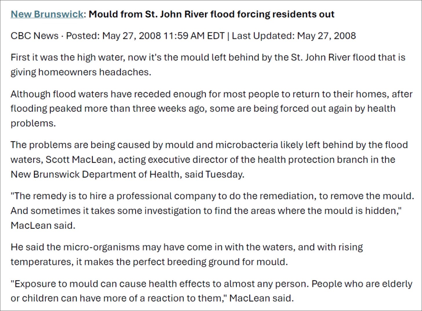 Yes. No question. The individuals in question live in a part of Canada on a peninsula. New Brunswick is bordered by water (Gulf of St. Lawrence, Northumberland Strait, Bay of Fundy) and does experience mold issues, often linked to its many rivers, frequent flooding from heavy rain/snowmelt/storms, and high humidity, creating conditions for mold growth in homes after water events. In fact, this was reported years ago by CBC News: