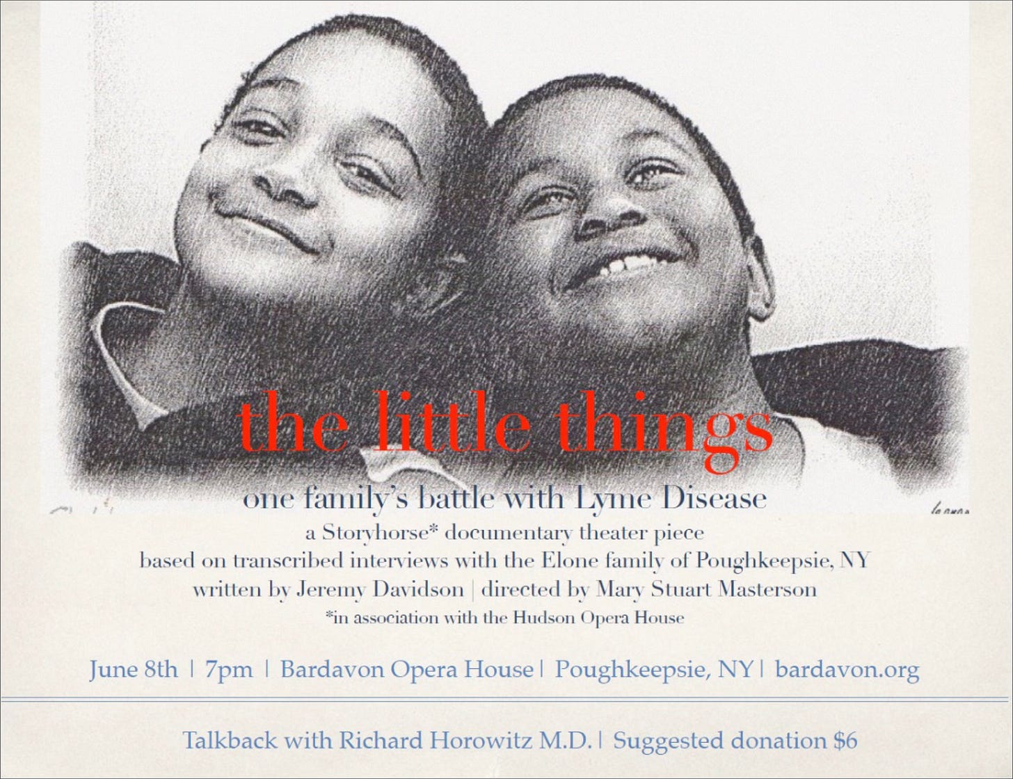 It’s bad enough that you can die from getting Lyme disease, as a young man in our area found out. He succumbed due to a 3rddegree heart block from Lyme disease after coming back from Rhode Island visiting colleges for the first time. Joseph Elone was on the front pages of our local paper and was one of several people that the CDC reported that year that died of Lyme carditis. The story was so moving that Mary Stuart Masterson, whom many of you know from TV and film (Fried Green Tomatoes, Benny and Joon, and most recently Blindspot which I highly advise seeing) ended up writing and directing a script with her husband Jeremy Davidson. The production was called ‘The Little Things.’ It discussed how a small tick can take a precious young life. I was in the talkback at the end of the show, answering questions with a live audience. It was performed in several theatres, including the Bardavon theatre in Poughkeepsie. See below: