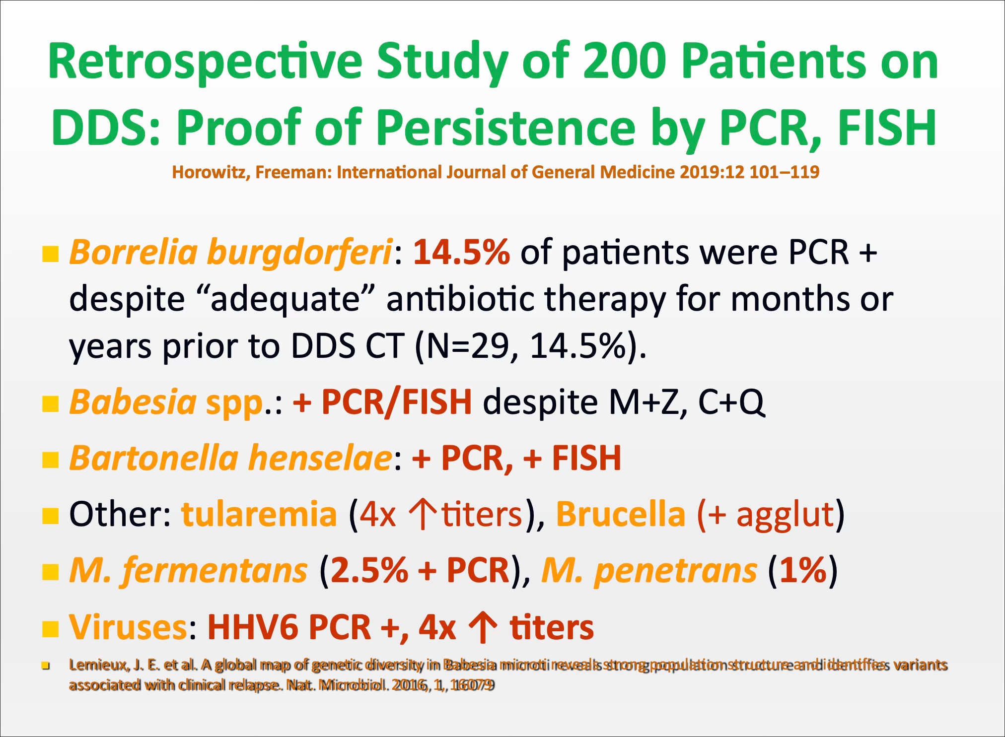 • Horowitz RI. Chronic Persistent Lyme Borreliosis: PCR evidence of chronic infection despite extended antibiotic therapy: A Retrospective Review. Abstract XIII Intl Sci Conf on Lyme Disease. Mar 24-26, 2000.
